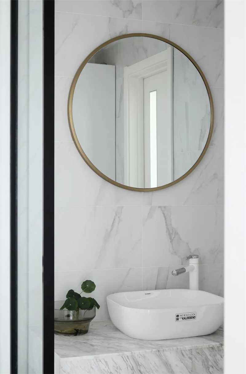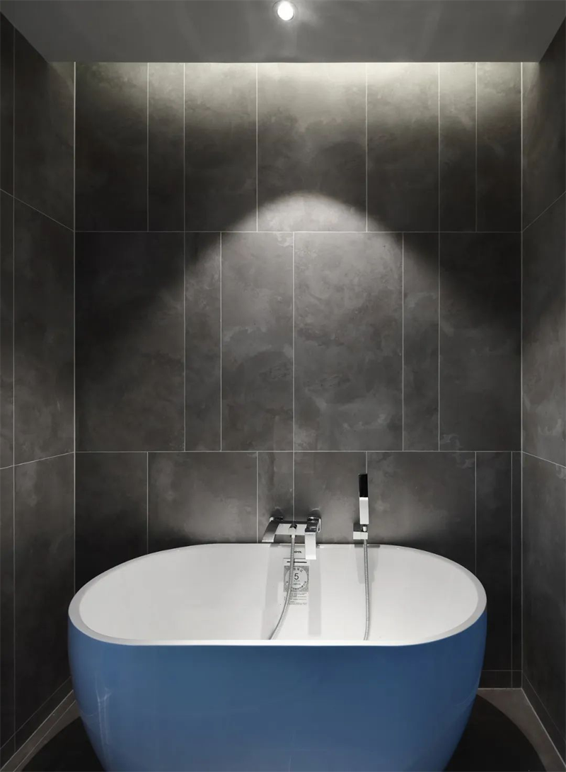 卫生间的洗手台设计简约,搭配定制储物柜,采用中性色调,为业主提供收纳空间的同时维持整洁。浴缸采用独立式设计,周围点缀着灰色瓷砖,强调了空间的纯粹与线条感,完美融合了日常实用性和美学价值,还为卫生间增添了一份艺术的韵味。