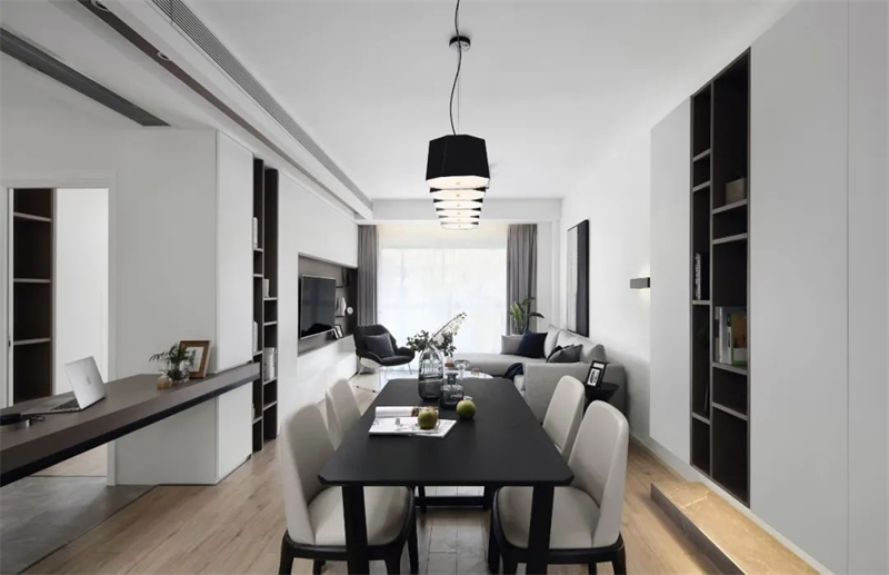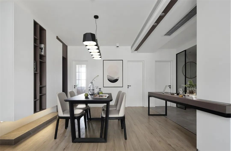 餐厅延续了极简风格,以简约的餐桌和现代餐椅为特色。白色墙壁和深色的定制柜创造了一个纯净的用餐环境。餐厅顶面的一排吊灯提供适当的亮度,并增添温馨氛围,不仅适合家庭用餐与客人的聚会,更使用餐成为一种愉悦的体验。