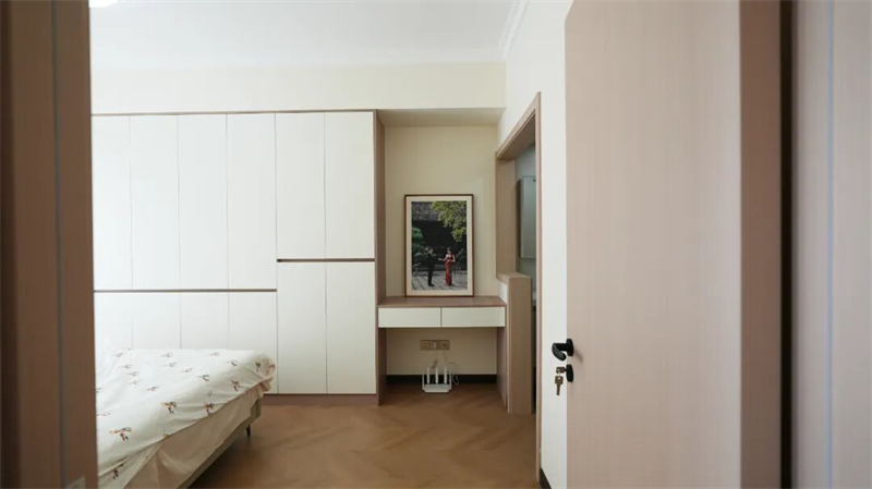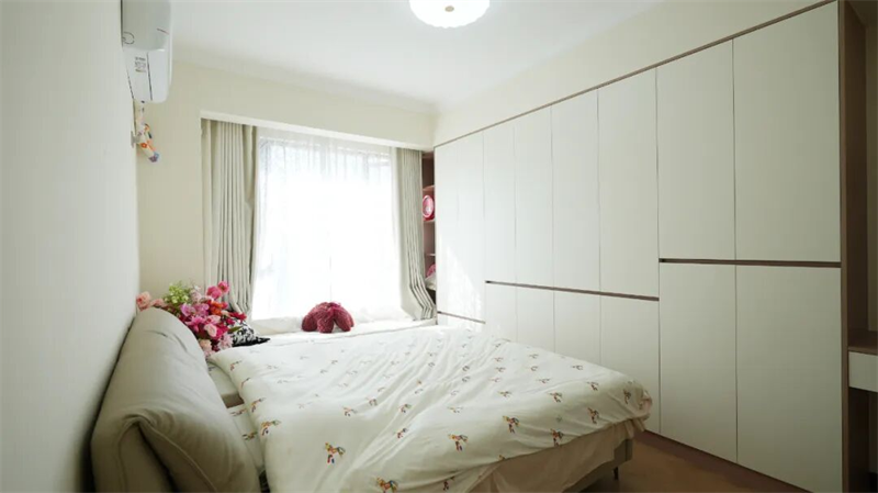 主卧以极简线条勾勒出宁静的休憩空间,延续原木奶油风的温柔基调,营造出如云朵般轻盈的睡眠氛围。通顶式奶油白衣柜搭配浅木色边框,简约而不失设计感,巧妙隐藏收纳,让空间整洁有序。床品选用清新印花图案,点缀一抹童趣与生机,与窗边一束鲜花相映成趣,唤醒生活的诗意。