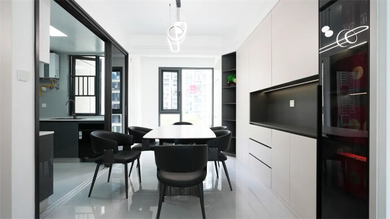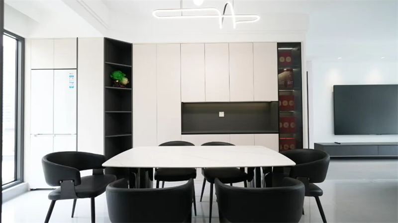 餐厅延续整体现代简约的基调,一张大尺寸岩板餐桌搭配六把黑色皮质餐椅,线条利落、质感高级,既满足家庭聚餐需求,也兼顾日常生活的仪式感。背景墙定制整面储物柜,白色柜门与深色开放式格架形成视觉对比,兼具收纳与展示功能。靠窗布局让自然光充分洒落,提升用餐时的通透感与舒适度。