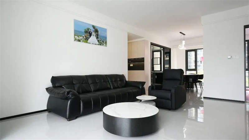 黑色皮质沙发线条流畅,质感高级,搭配圆形大理石茶几与格纹边几,形成现代而舒适的会客区。通透落地窗将自然光引入室内,高光地砖映照出明亮通达的空间氛围,让每一寸光线都成为生活的注脚。墙上一幅婚纱照静静诉说着家的归属与情感记忆,而远处阳台的“囍”字贴纸,则为这份理性之美添上一抹温情的仪式感。