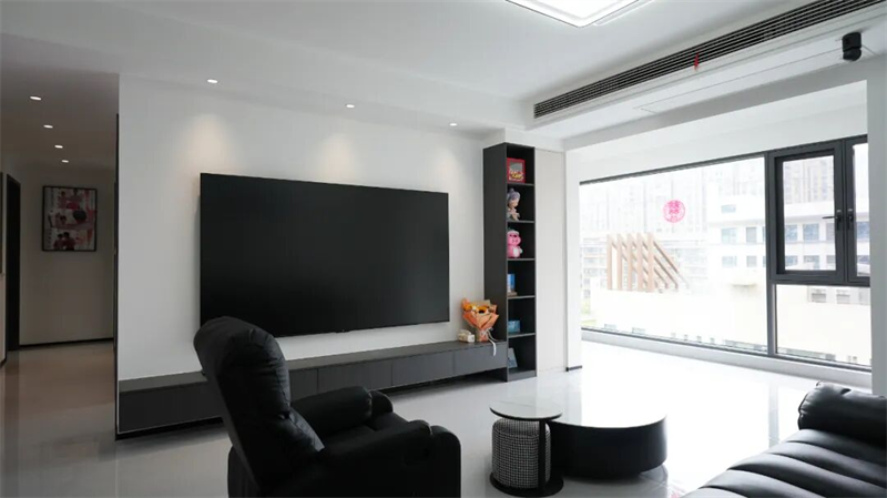 客厅以极简美学为底色,用黑白灰的纯粹配比勾勒出干净利落的空间轮廓。整面墙悬挂的超大尺寸电视,搭配悬浮式深灰色电视柜,营造出视觉上的轻盈与秩序感。一侧嵌入式开放式置物架巧妙融入收纳与展示功能,陈列着温馨小物与趣味摆件,在冷静中注入生活温度。