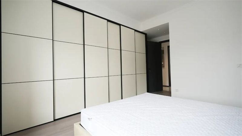 次卧延续整体现代简约风格,以克制的色彩与利落的线条营造出安静、整洁的休憩氛围。整面墙定制衣柜,以浅色柜门配黑色装饰线条,简洁大方又不失设计感,有效提升收纳能力的同时保持视觉清爽。床侧小巧床头柜实用而不占空间,满足日常置物需求。